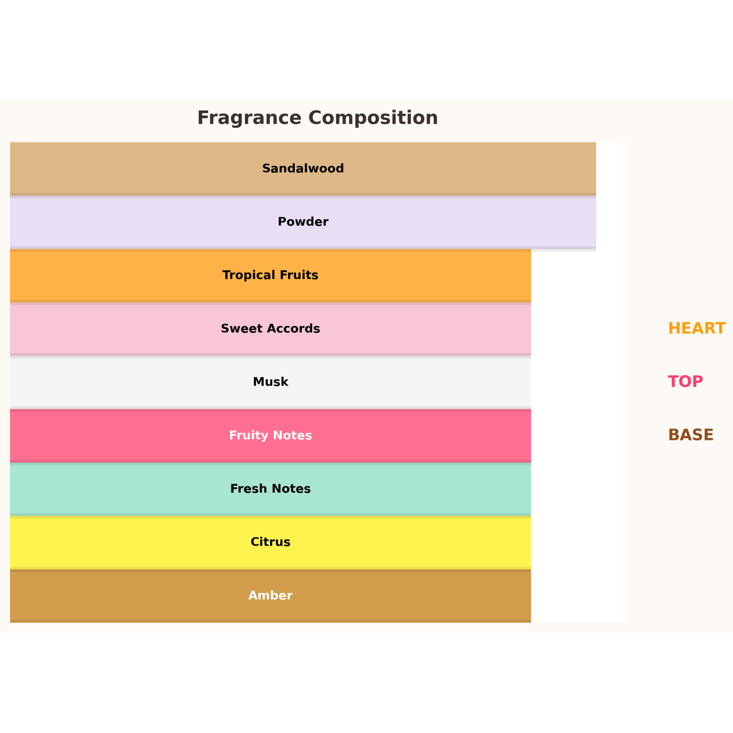 Afnan Souvenir Desert Rose opens with a juicy explosion of fruit—peach, raspberry, and blackcurrant—underscored by sweet accents and soft musk. The heart introduces a delicate powdery tone combined with the exotic freshness of tropical fruits. A warm base of creamy sandalwood, bright citrus, and rich amber envelop the fragrance, providing depth and longevity.