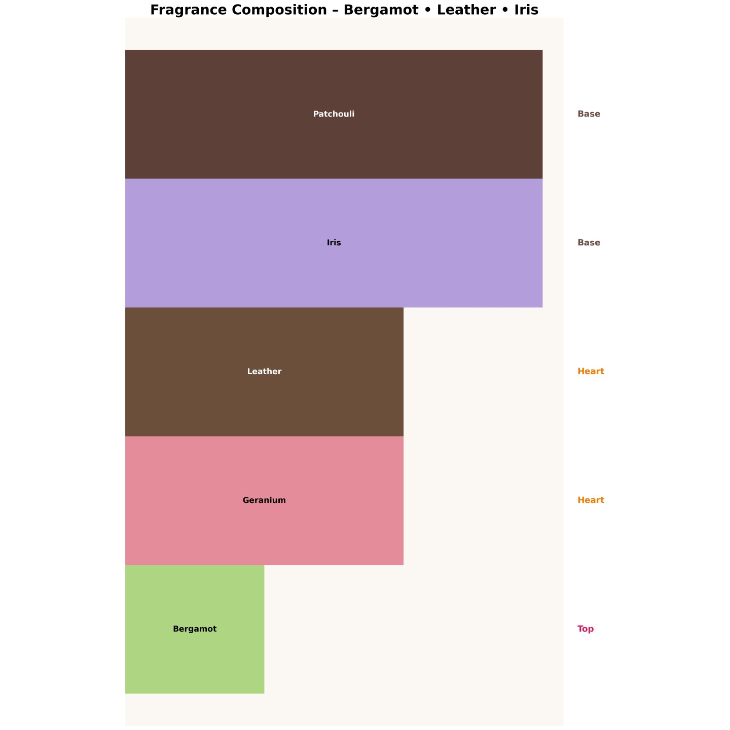 Fresh citrus in the opening, elegant leather in the heart and deep, powdery wood in the base.