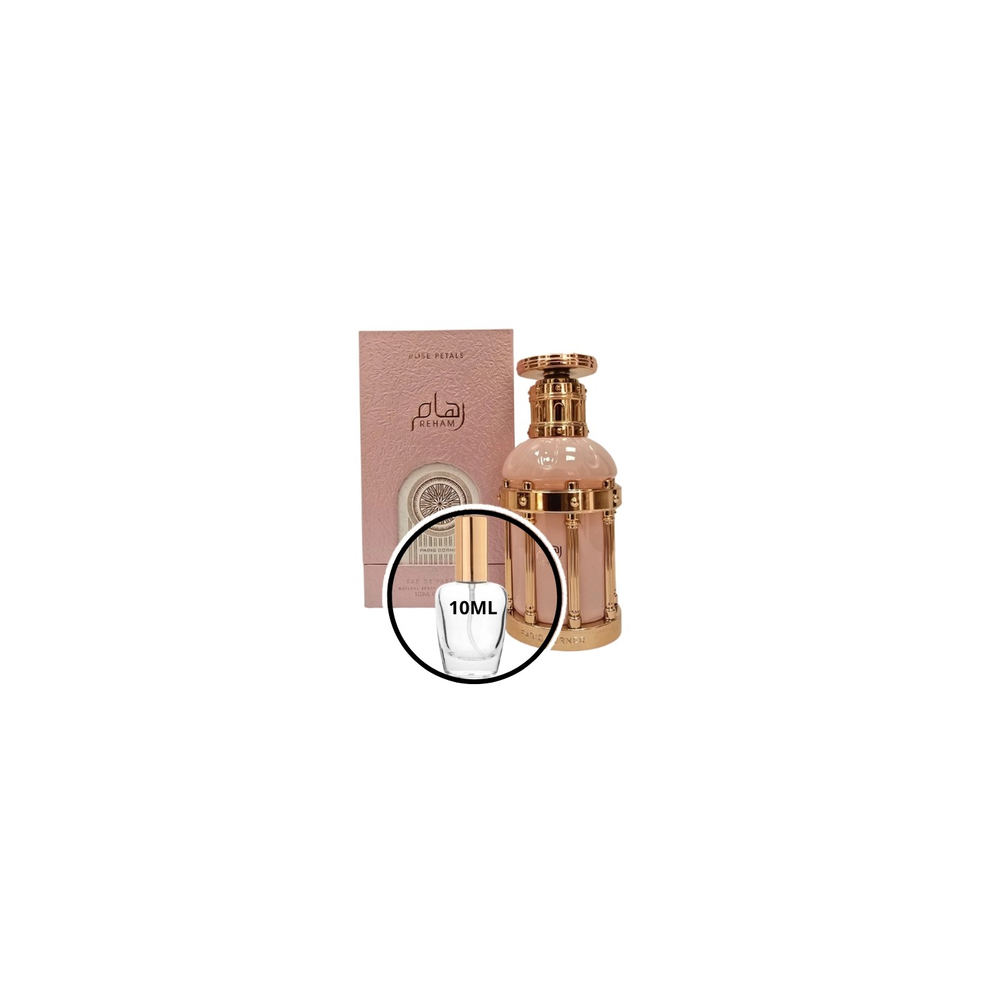 Reham Rose Petals is a fragrance celebrating radiant femininity – subtle, soft, and yet sensual. This composition envelops like a satin shawl, combining the classic beauty of rose accords with a modern, light freshness and a warm, balsamic lasting power. The opening creates a juicy and elegant duet of raspberry and lychee, enhanced by the citrus freshness of bergamot. This sparkling, feminine opening makes the fragrance captivating from the very first moment. A soft rose blooms in the heart, enveloped in sensual cashmere and light aquatic notes, giving the composition a modern transparency and velvety depth. The base is filled with warmth: musk, creamy vanilla, noble sandalwood, and intense amber leave a delicate, sensual, and elegantly sweet aura on the skin. This fragrance is for women who want to smell pure, romantic, and sophisticated – not overwhelming, but magnetic. The 10ml decant allows you to sample the composition and conveniently carry it with you.