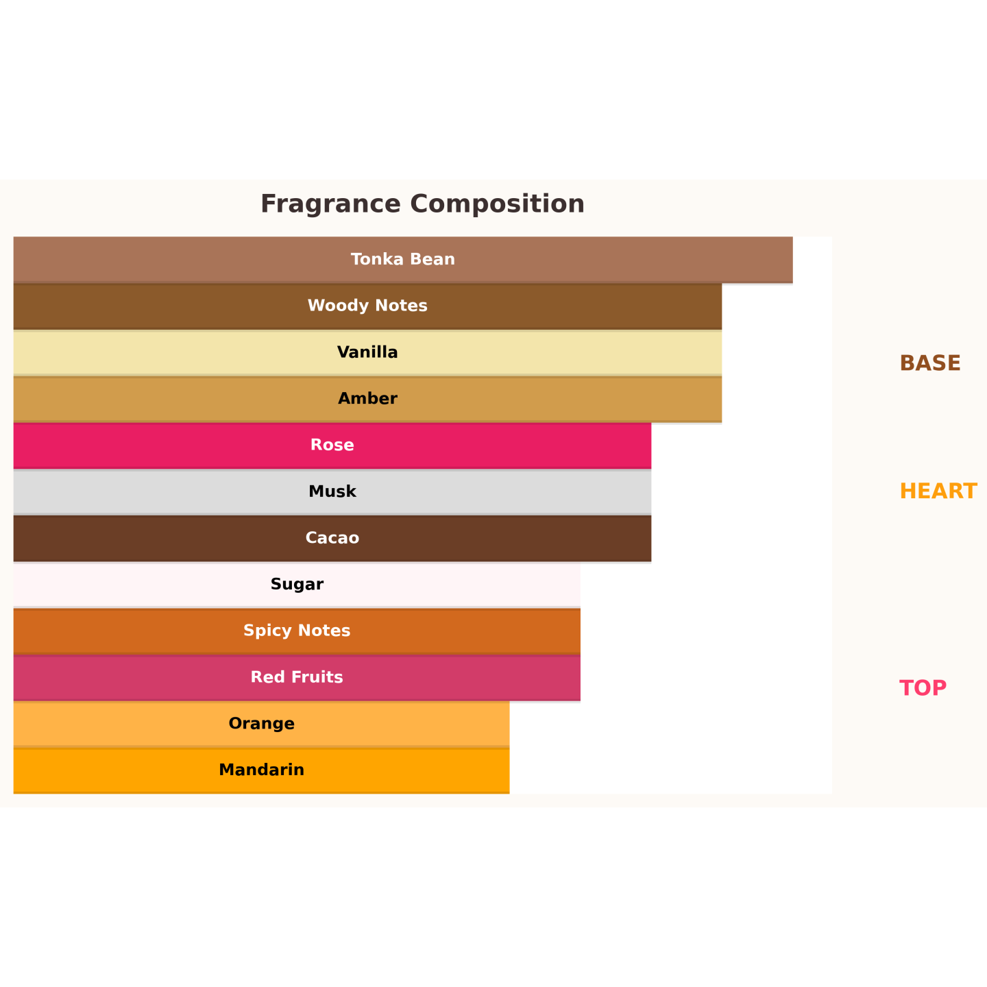 A sensual yet subtle gourmand that combines joyful, fruity freshness with warmth and elegance. The opening is sugar, red fruits, mandarin, and orange – a slightly sweet, energizing experience. In the heart, vanilla, cocoa, spices, and rose create a creamy softness and intimate depth. A base of tonka bean, amber, musk, and woody notes leaves a long, velvety trail.