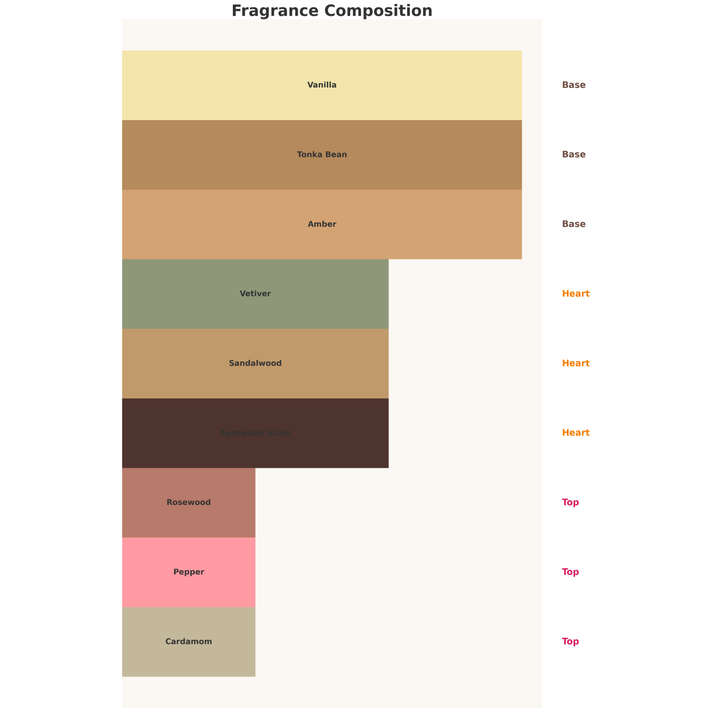 Oriental, warm and sensual: pepper and saffron in the opening, incense and tonka bean in the heart, and vanilla and dry wood in the base.