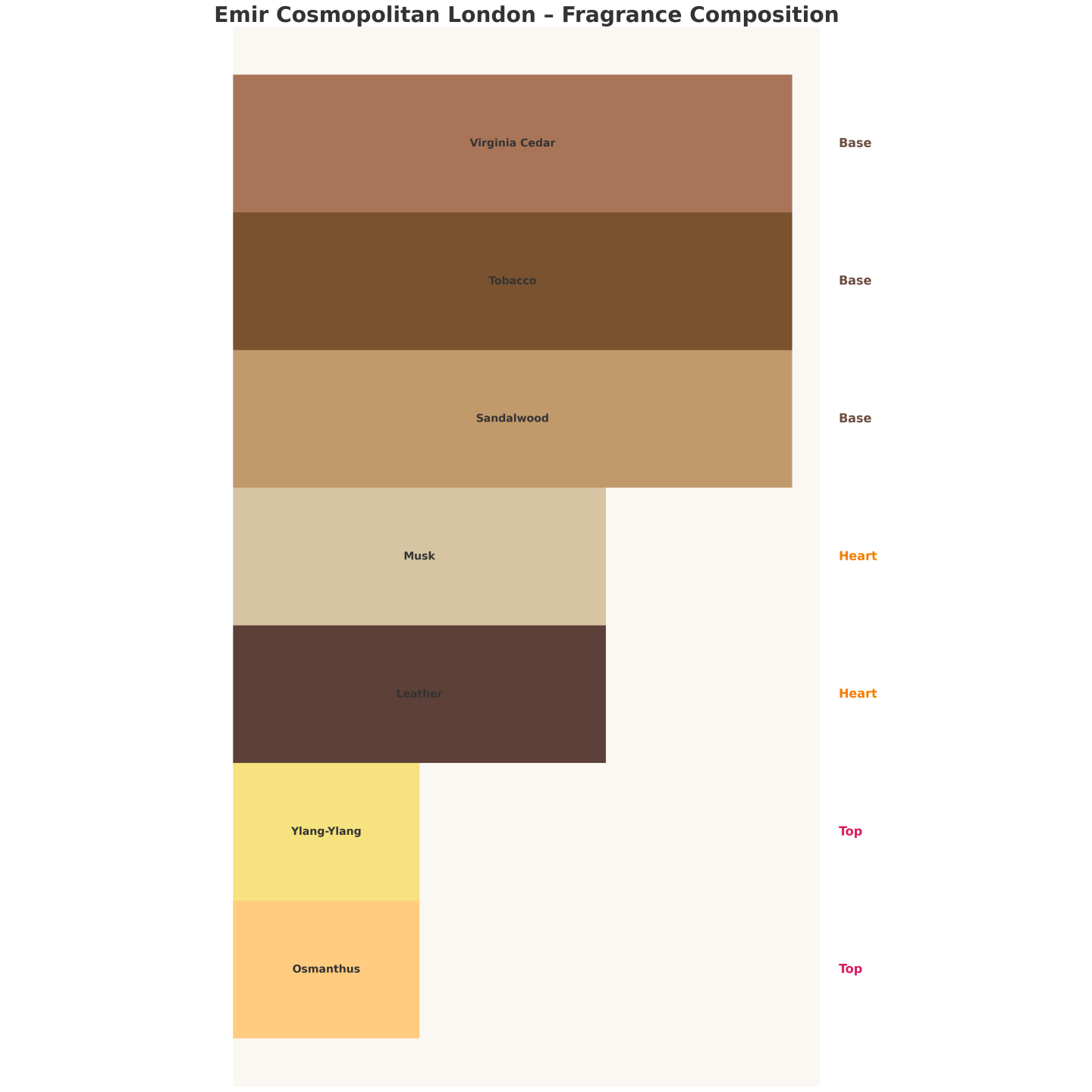 Emir Cosmopolitan London is a fragrance that captures the atmosphere of the British capital – distinguished and elegant on the one hand, yet full of character, nonchalance, and subtle mystery on the other. This composition is for those who appreciate distinctive, modern perfumes with a touch of classic British elegance. The opening evokes a London morning: bergamot, dry black tea, and spicy pepper create a cool, fresh, spicy introduction, brimming with energy and a sense of style. At the heart of the fragrance, noble iris, sensual leather, and aromatic herbs bloom, giving the composition a refined depth and a masculine-feminine balance. The base is si on creamy guaiac wood, warm amber, and enveloping musk, ensuring longevity and a soft, elegant finish. This is a fragrance perfect for cool days, evenings out, meetings in atmospheric locations, and situations where style matters – without unnecessary exaggeration, ale with a distinct accent of individuality.