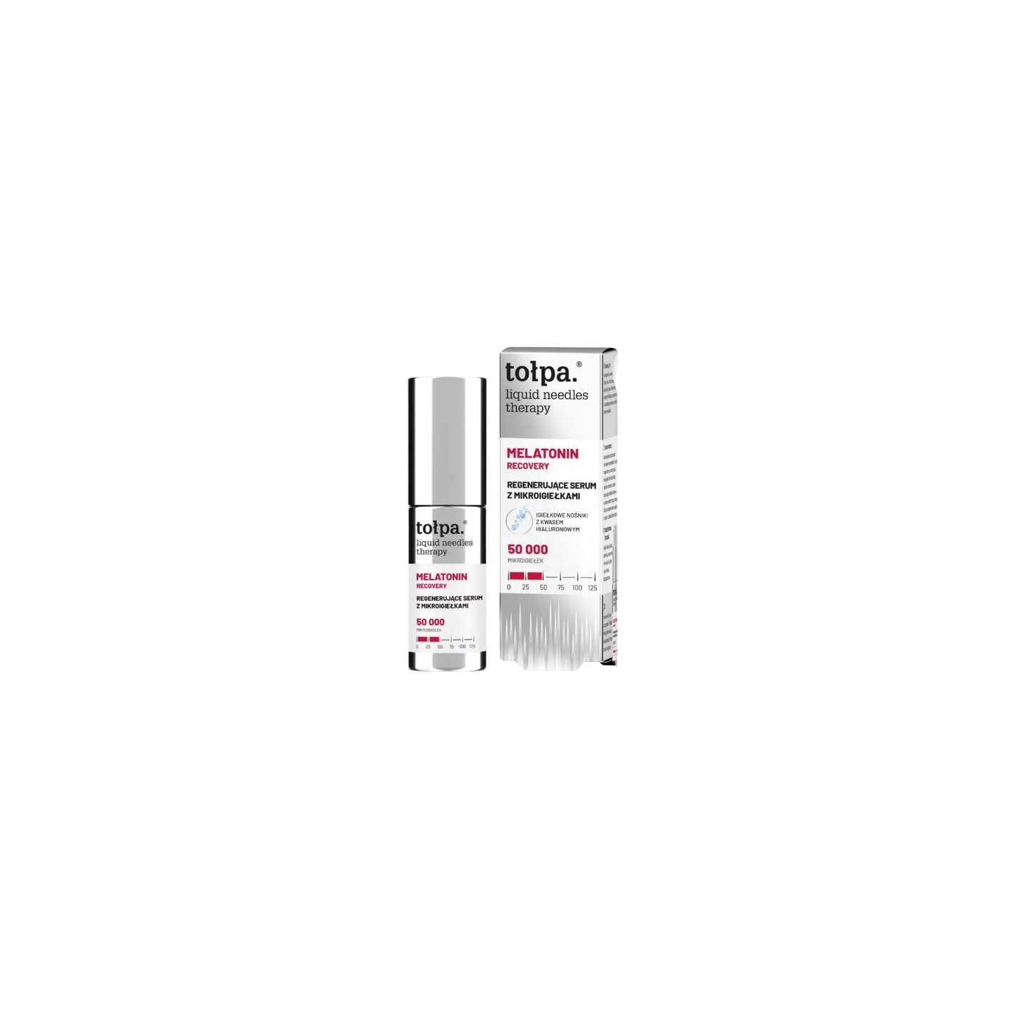 Melatonin Recovery is an advanced regenerative serum that utilizes modern microneedle technology to deliver active ingredients deeper than traditional formulas. Each application utilizes 50,000 microscopic microneedles from the freshwater sponge Spongilla fragilis. Upon contact with the skin, they gently loosen the epidermis, creating microchannels that facilitate the penetration of active ingredients—non-invasively, without disrupting the skin's integrity. The serum intensively stimulates regenerative processes, supports nighttime renewal, and improves skin condition from the very first application. Melatonin enhances the natural rhythm of cell renewal, five forms of hyaluronic acid provide multi-layer hydration and smoothing, and Tołpa® peat acts as a plant-based antioxidant concentrate that supports sensitive and delicate skin. The light, velvety, and fragrance-free formula with jojoba oil si quickly, leaving no stickiness, and is comfortable even for skin prone to irritation. After application, you may feel a slight tingling sensation – this is a natural effect of the microneedles and a signal that the active ingredients are being transported deep into the skin.