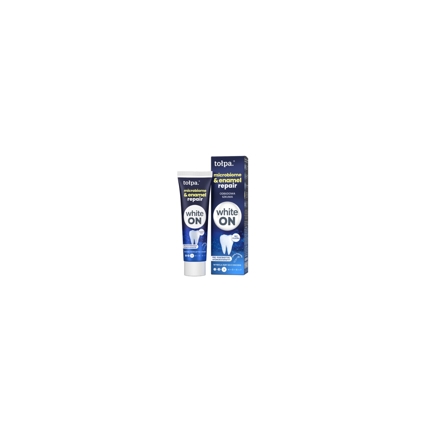 Fluoride-free toothpaste is a modern toothpaste designed for comprehensive oral care. It combines whitening, enamel-rebuilding, and natural microbiome support. The advanced formula, based on PAP (phthalimidoperoxycaproic acid), effectively removes discoloration and helps lighten enamel by up to several shades without damaging its structure. Hydroxyapatite supports enamel regeneration and strengthens teeth, improving their resistance to damage. The formula is enriched with pre- and postbiotics (including Bifida Ferment Lysate and inulin), which support the balance of the oral microbiome. Additionally, niacinamide supports oral health and provides protection, while xylitol helps limit the growth of bacteria responsible for tooth decay. The toothpaste is fluoride-free and suitable for daily use, even with electric and sonic toothbrushes.