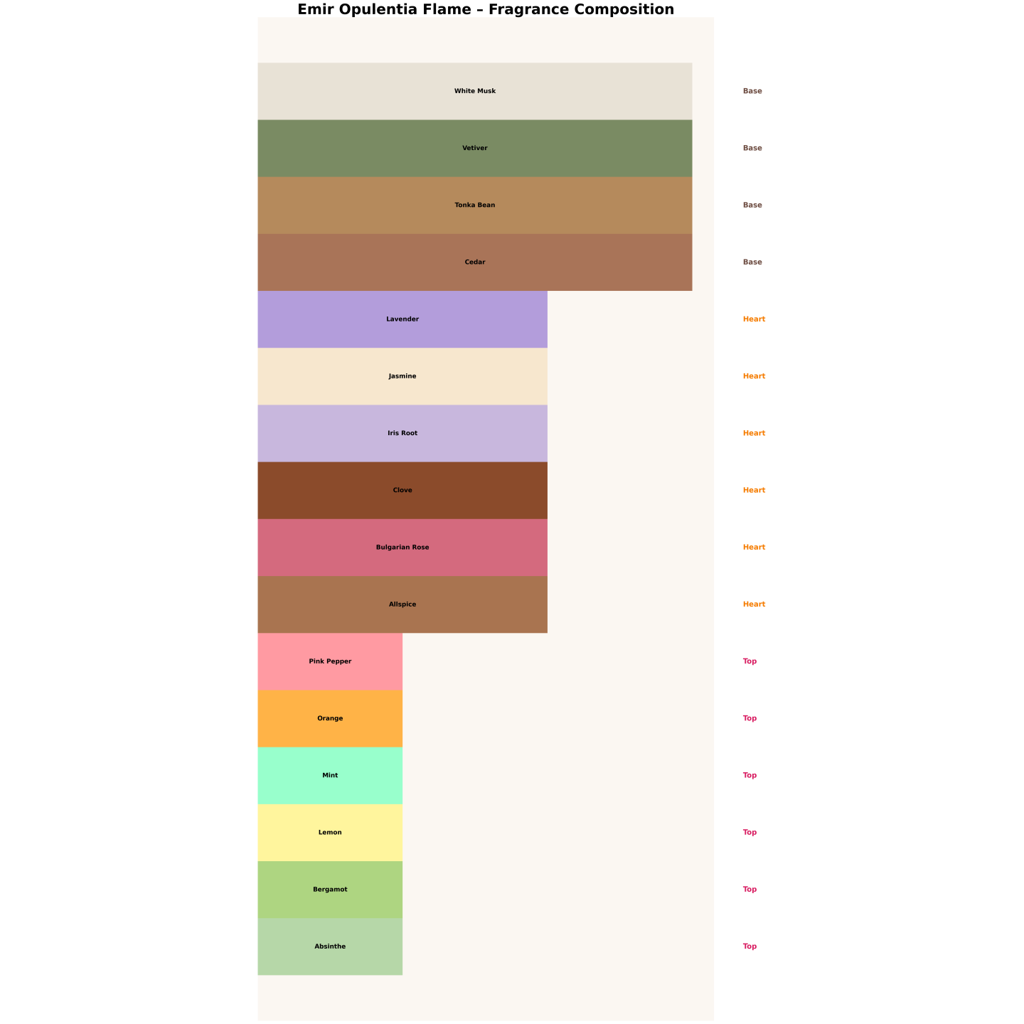 Opulentia Flame is a composition for those who desire to si out from the crowd and consciously build their presence through scent. This perfume has an intense, fiery soul – full of energy, courage, and magnetic charm. The expressive character of the opening, the richness of spices in the heart, and the elegant, woody-musky base create a harmonious yet uncompromising whole. The opening begins with a strong accent of pink pepper, fresh mint, bergamot, lemon, dry absinthe, and juicy orange – an explosive blend of freshness and spicy spark. The heart of the fragrance pulsates with aromatic and floral richness: lavender, Bulgarian rose, clove, allspice, jasmine, and powdery orris root, creating an elegant, intense, and multi-dimensional mid-layer. The base is built on earthy vetiver, noble cedar, soft white musk, and creamy tonka bean, lending the composition warmth, longevity, and a sensual finish. This is a fragrance for those who want to feel the fire within – decisiveness, spontaneity, and readiness for action. Perfect for those who want to leave a lasting impression at every event.