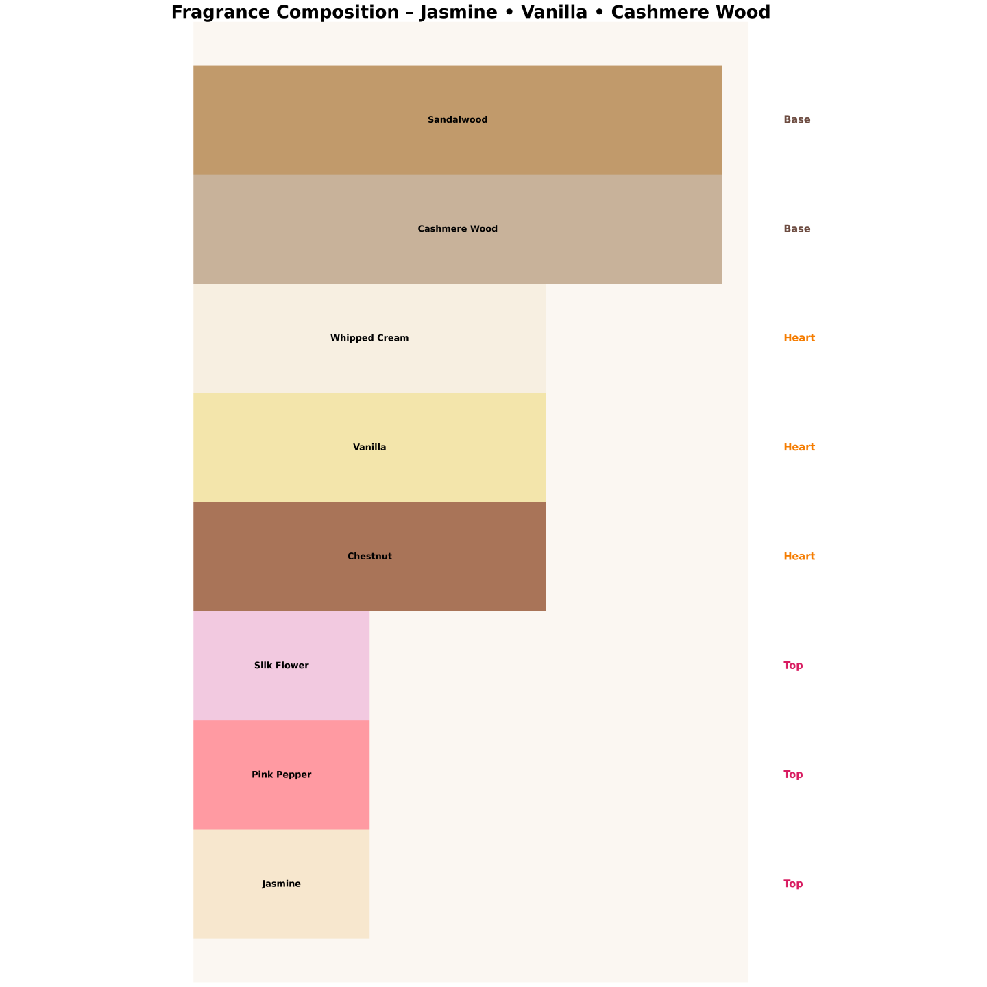 Słodko, kremowo i drzewnie — jaśmin i różowy pieprz w otwarciu, kasztan i wanilia w sercu, kaszmir i sandałowiec w bazie.