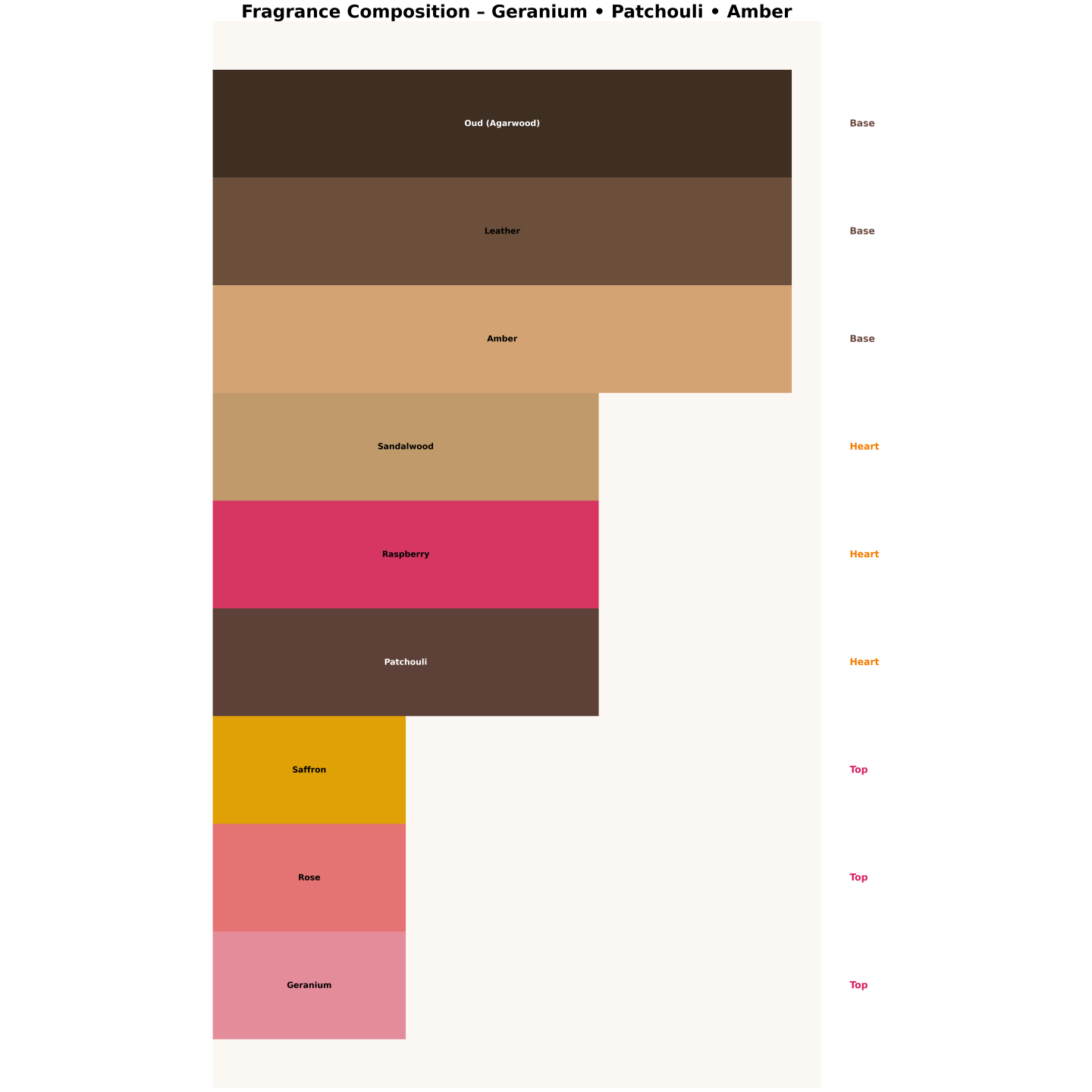Orientalnie, słodko i dymnie — z szafranem i różą w otwarciu, kremowym sandalem i maliną w sercu oraz intensywną, skórzano-oudową bazą.