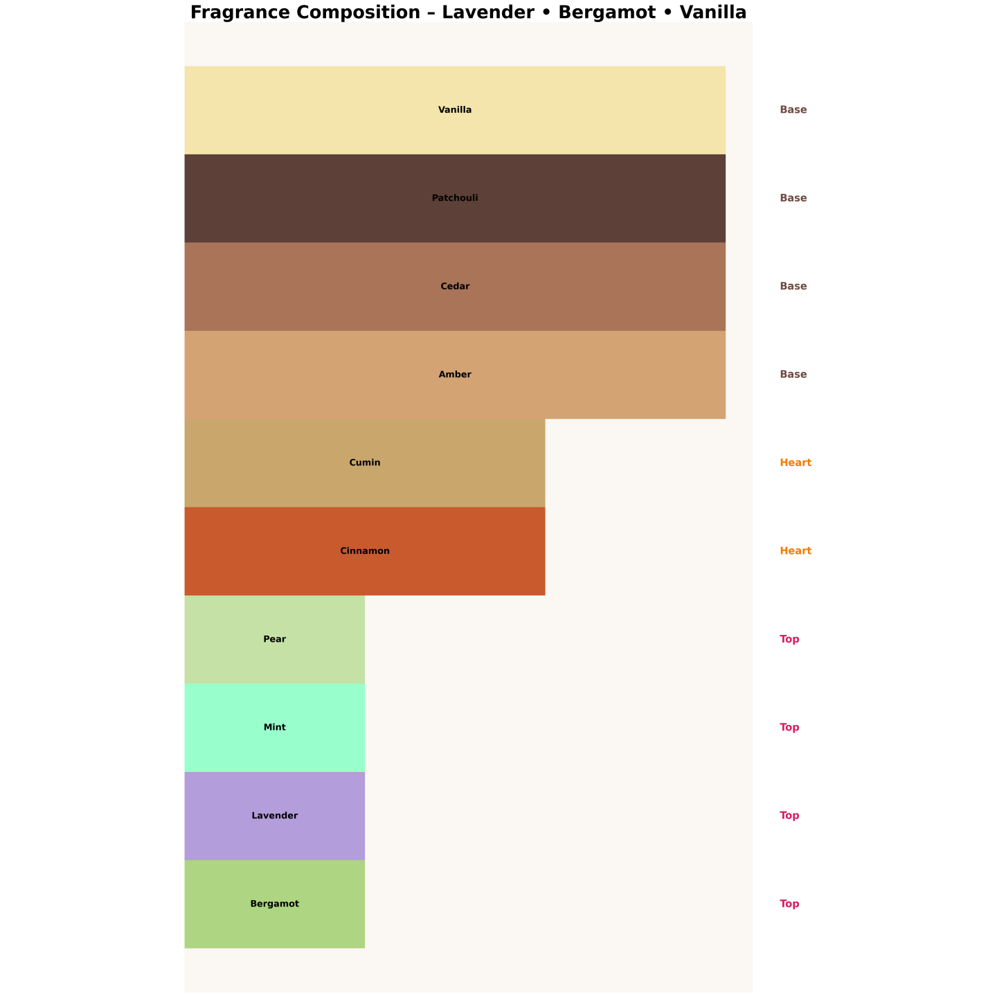 Słodko, świeżo i korzennie: gruszka i mięta w otwarciu, cynamon i kminek w sercu, a w bazie kremowa wanilia i drzewne akordy.