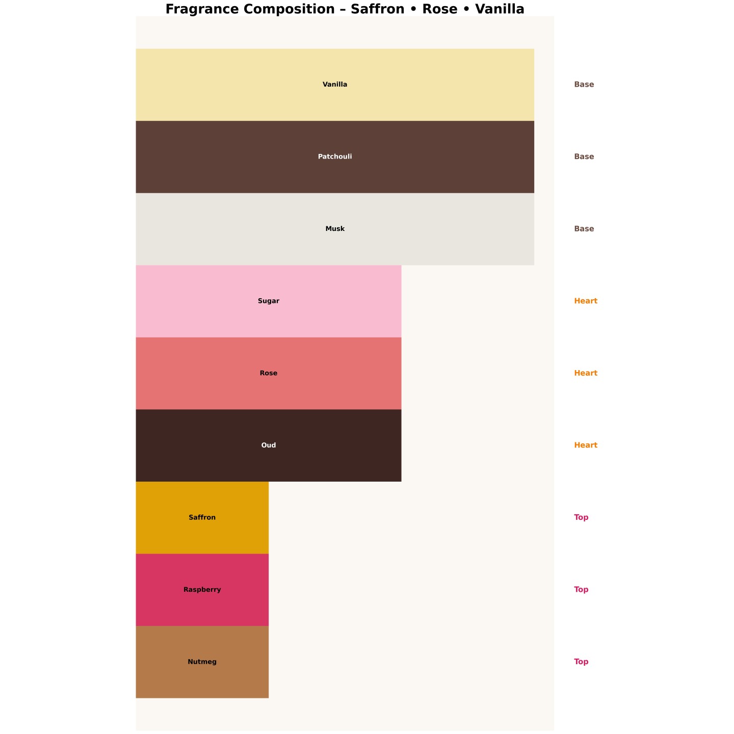 Ciepło, orientalnie i słodko — szafran i malina w otwarciu, róża i oud w sercu, wanilia i piżmo w bazie.