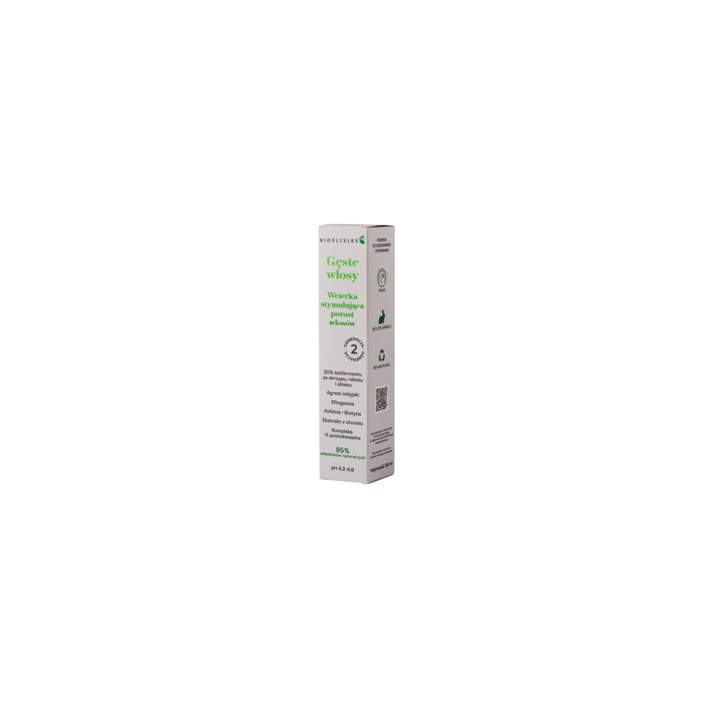 Wcierka „Gęste Włosy” II Generacji to zaawansowana formuła trychologiczna oparta na składnikach o potwierdzonym naukowo działaniu. Zawiera aż 20% biofermentu postbiotycznego na bazie skrzypu polnego, rdestu ptasiego i aloesu, który dogłębnie odżywia skórę głowy oraz wspiera aktywność mieszków włosowych. Dzięki obecności sfinganiny, kofeiny, biotyny, agrestu indyjskiego i kompleksu 11 aminokwasów wcierka skutecznie ogranicza nadmierne wypadanie włosów oraz wspiera ich zagęszczenie. Blokuje działanie hormonu DHT odpowiedzialnego za łysienie androgenowe oraz stabilizuje cykl życia włosa, wydłużając fazę anagenu. Proces fermentacji zastosowanych ekstraktów roślinnych zwiększa ich biodostępność, co przekłada się na lepsze wchłanianie i widoczne efekty już po miesiącu regularnego stosowania. Formuła nie zawiera SLS, siarczanów, silikonów, PEG, PPG, oleju mineralnego ani sztucznych barwników.