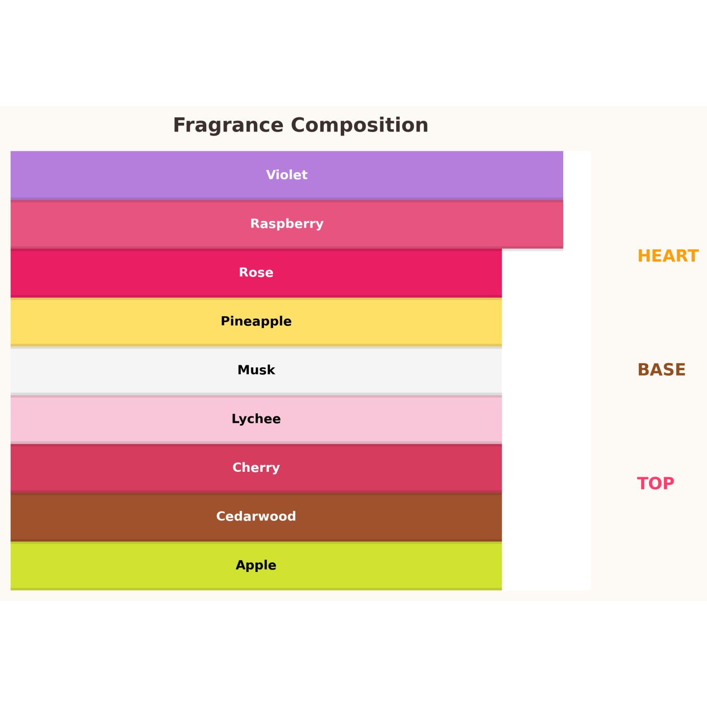 Woda Perfumowana Unisex – radosna, kwiatowo-owocowa kompozycja pełna świeżości i lekkości. Soczyste liczi, wiśnia i jabłko w otwarciu, kwiatowe serce z fiołkiem i różą oraz baza z malin, piżma i cedru tworzą harmonijny, pełen życia zapach