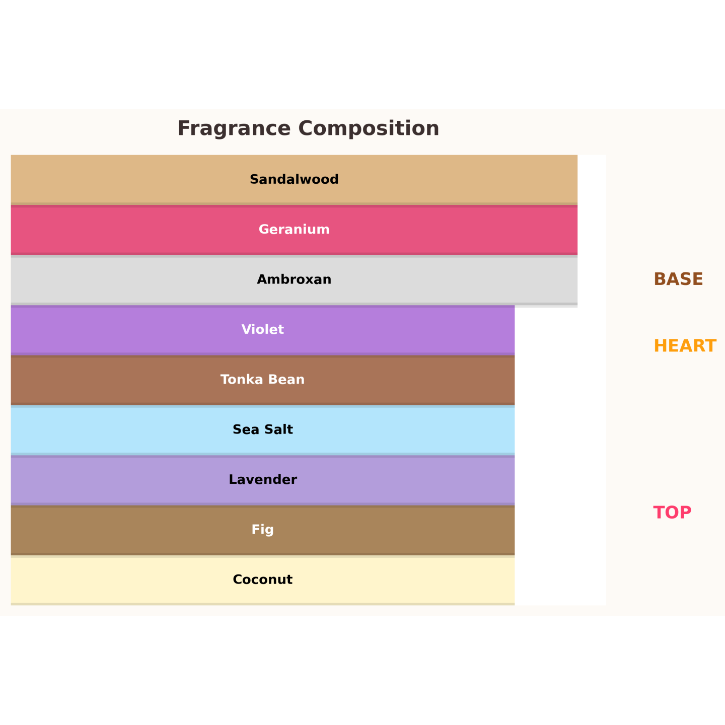 Cosmic Giardino przenosi na rajską plażę: pierwsze sekundy to świeża, słodko-słona fala kokosa, soli morskiej i soczystej figi, jak łyk letniego koktajlu. W sercu wybrzmiewa aromatyczne geranium, elegancka lawenda i subtelny fiołek, które nadają klasę i równowagę. Finisz otula skórę ciepłem drewna sandałowego, świetlistym ambroksanem i kremową fasolką tonka – trwały, nowoczesny, niezwykle wakacyjny ślad.