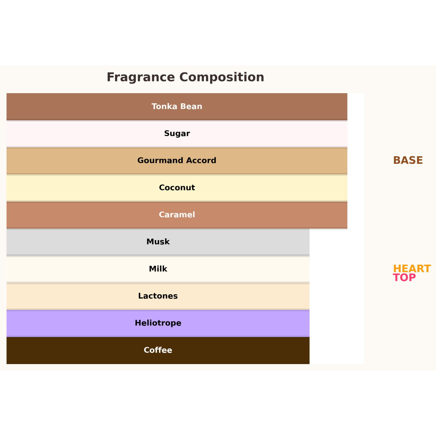 Coffee Eternal otwiera się esencją palonej kawy, miękką chmurką mleka i gęstym karmelem. W rozwoju pojawia się kremowy kokos i laktony, które dodają deserowej, aksamitnej słodyczy. W sercu króluje pudrowy heliotrop, nadając zapachowi „chmurkowej” lekkości. Finisz ocieplają piżmowe niuanse i fasolka tonka, przykryte delikatną cukrową skorupką i akordem gourmand – kompozycja staje się miękka, cielesna i niezwykle otulająca. Idealny na wieczór i chłodniejsze miesiące, gdy masz ochotę na luksusowy, deserowy komfort.