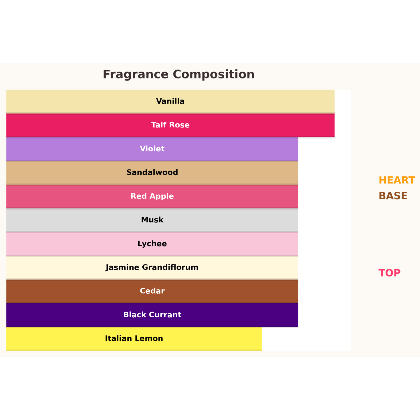 Khair Fusion otwiera się energetycznym, owocowym akordem liczi, czarnej porzeczki, czerwonego jabłka i włoskiej cytryny. Po chwili kompozycja miękko przechodzi w kwiatowe serce – szlachetną różę z Taif, aksamitny jaśmin wielkolistny i urzekający bratek, które nadają całości elegancji i głębi. Finisz jest ciepły i kojący: wanilia z piżmem spotykają się ze szlachetnym cedrem i drzewem sandałowym, zostawiając harmonijny, długotrwały ślad.