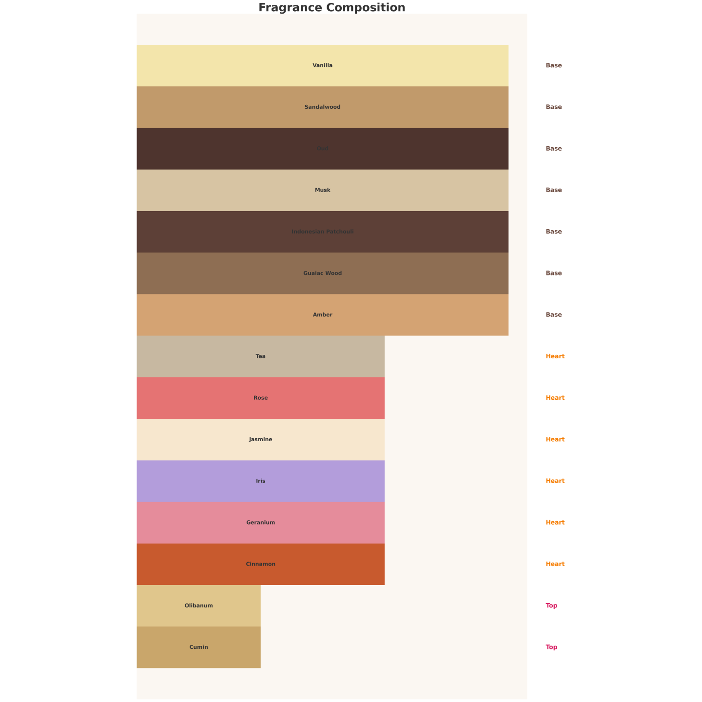 ✔ Podstawa: Oud, Paczula Indonezyjska, Bursztyn, Wanilia, Piżmo, Drzewo Gwajakowe, Drzewo Sandałowe