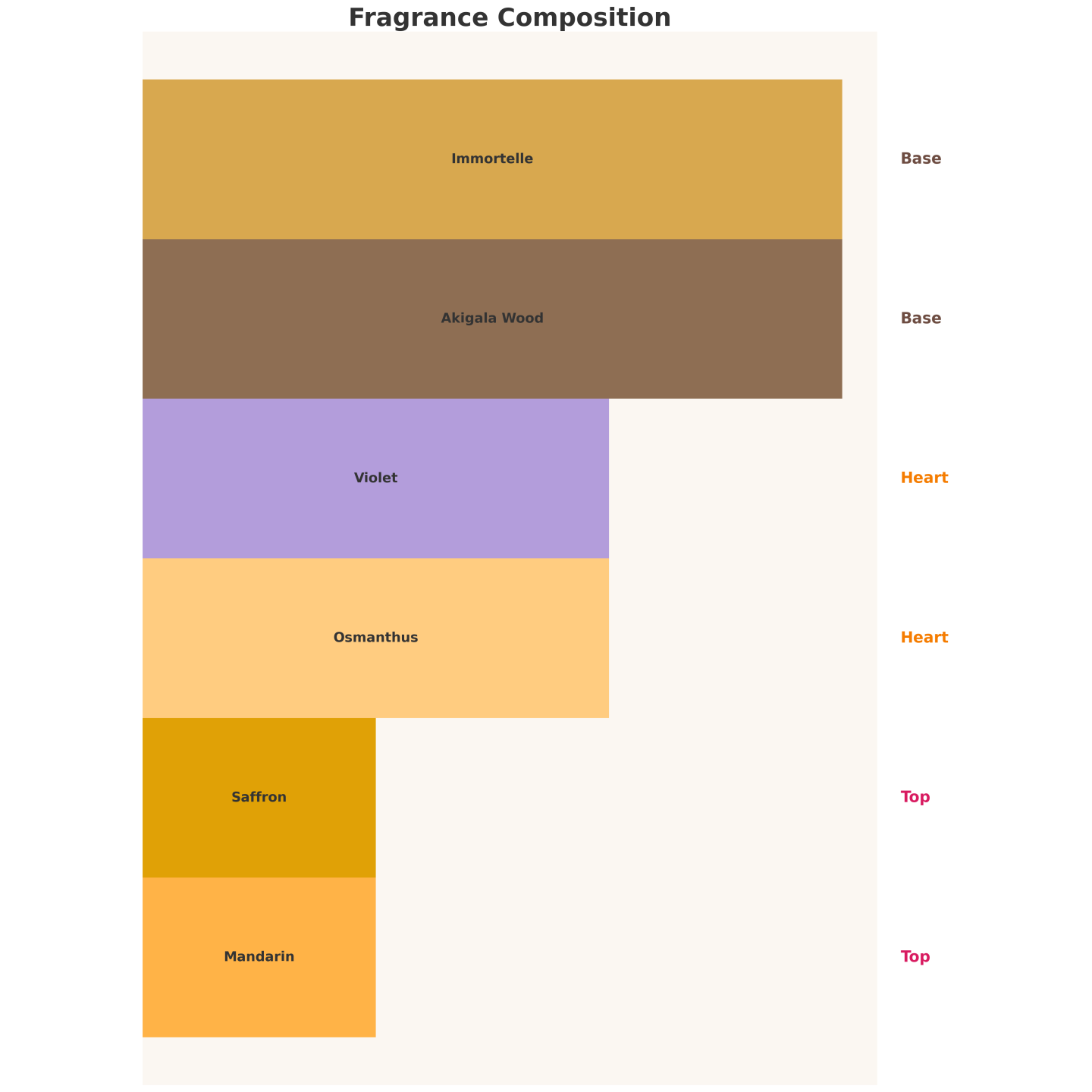 To elegancka mieszanka mandarynki i szafranu, pudrowego fiołka, delikatnie morelowego osmantusa oraz ciepłej, głębokiej bazy z akigali i nieśmiertelnika.