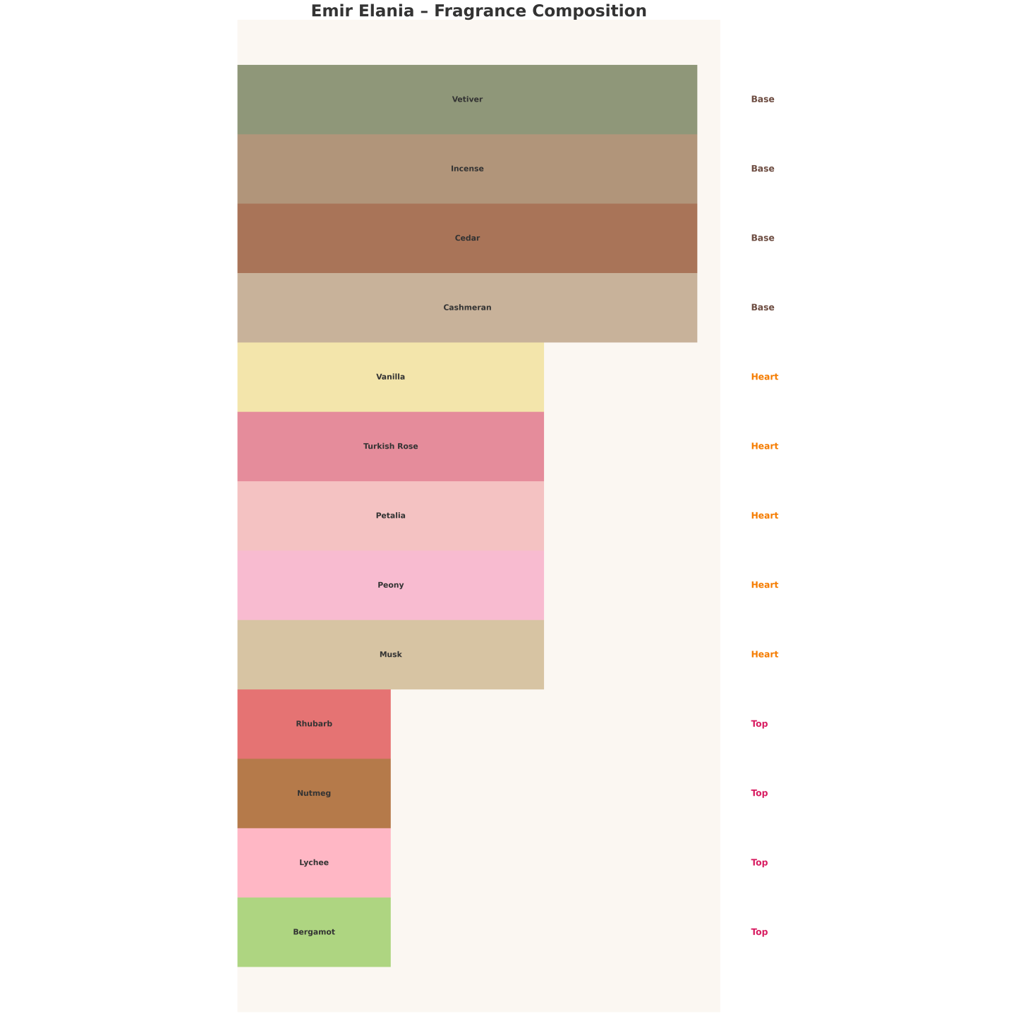 Emir Elania to perfumy, które przenoszą do królewskiego ogrodu skąpanego w promieniach słońca – miejsca, gdzie powietrze jest pełne słodyczy owoców i majestatycznych róż. To zapach stworzony dla nowoczesnej romantyczki: kobiety eleganckiej, pewnej siebie, ale jednocześnie delikatnej i pełnej wdzięku. Kompozycja otwiera się wybuchową świeżością liczi oraz lekko cierpkim, soczystym rabarbarem, podkreślonym światłem bergamotki i pikantnością gałki muszkatołowej. Ten akord jest radosny, chrupiący i natychmiast przyciąga uwagę. W sercu rozkwita prawdziwa królewska para – róża turecka i puszysta piwonia, które z pomocą piżma, wanilii oraz nowoczesnej nuty petalia tworzą aksamitne, kobiece i komplementogenne serce kompozycji. Baza otula skórę elegancką ciepłą mgiełką drewna kaszmirowego, szlachetnego cedru, ziemistej wetywerii oraz subtelnego kadzidła, nadając całości trwałości, zmysłowości i wyrafinowania. Emir Elania to zapach, który zaskakuje, rozpieszcza i pozostawia po sobie piękny, kobiecy „ogon”. To perfumy dla tych, które uwielbiają czuć się jak najlepsza wersja siebie.