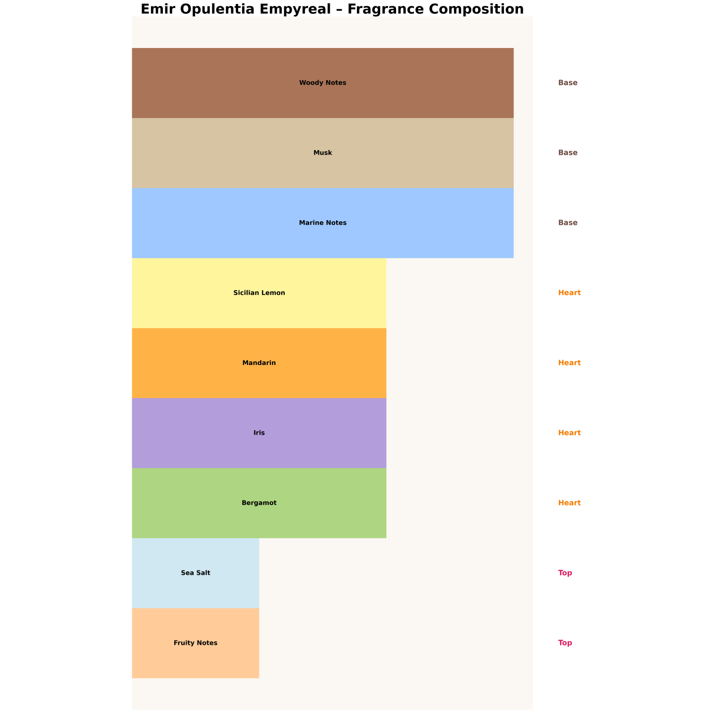 Opulentia Empyreal to zapach stworzony dla osób, które pragną elegancji w nowoczesnej, lekkiej formie. To kompozycja pełna klasy, przejrzystości i harmonii — idealna na momenty, kiedy chcesz pachnieć świeżo, stylowo i świetliście. Inspiruje do zanurzenia się w atmosferze luksusu, gdzie nuty cytrusowe, kwiatowe i drzewne splatają się w czystą, wyważoną całość. Otwiera się energetyzującą mieszanką owoców połączoną z mineralną, świeżą solą morską, która od razu wprowadza uczucie czystości i promienności. W sercu kompozycji wyczuwalne są eleganckie akordy sycylijskiej cytryny, jasnej bergamotki, pudrowego irysa oraz soczystej mandarynki – połączenie świeżości, delikatności i subtelnego luksusu. Baza otula skórę miękką mgiełką nut morskich, czystego piżma oraz nut drzewnych, które nadają kompozycji trwałość i wyrafinowane zakończenie. To zapach idealny dla osób, które lubią kompozycje lekkie, eleganckie, czyste i ponadczasowe — pozostawiające świeże, niezwykle przyjemne wrażenie.