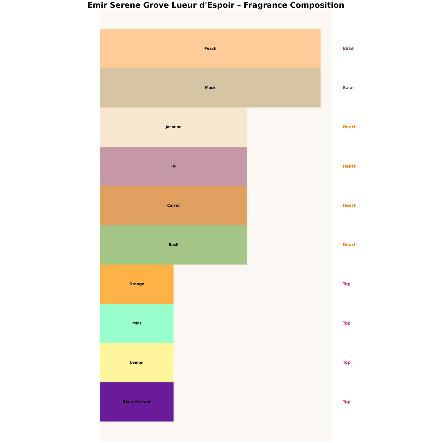 Emir Lueur d’Espoir Serene Grove to zapach dla osób, które kochają zacząć dzień od dawki świeżości, optymizmu i aromatycznej równowagi. To kompozycja stworzona z myślą o tych, którzy cenią kontakt z naturą, czyste powietrze i energetyzujące akordy cytrusów oraz ziół. Jest lekki, a jednocześnie z charakterem, idealny na ciepłe pory roku i dynamiczne tempo życia. Otwarcie zachwyca soczystym połączeniem czarnej porzeczki, cytryny, pomarańczy oraz chłodnej mięty — to eksplozja świeżości, która pobudza i odświeża umysł. W sercu kompozycji żywe nuty bazylii, słodko-ziołowej marchwi, delikatnego jaśminu oraz kremowej figi tworzą aromatyczny, naturalny akord pełen miękkiej zielonej harmonii. Baza jest lekka, ale przyjemnie owocowa: brzoskwinia dodaje soczystości, a piżmo zapewnia czystość, trwałość i subtelną sensualność. Serene Grove to kompozycja dla miłośników oryginalnych, ziołowo-cytrusowych zapachów, które wzmacniają energię i inspirują do działania.