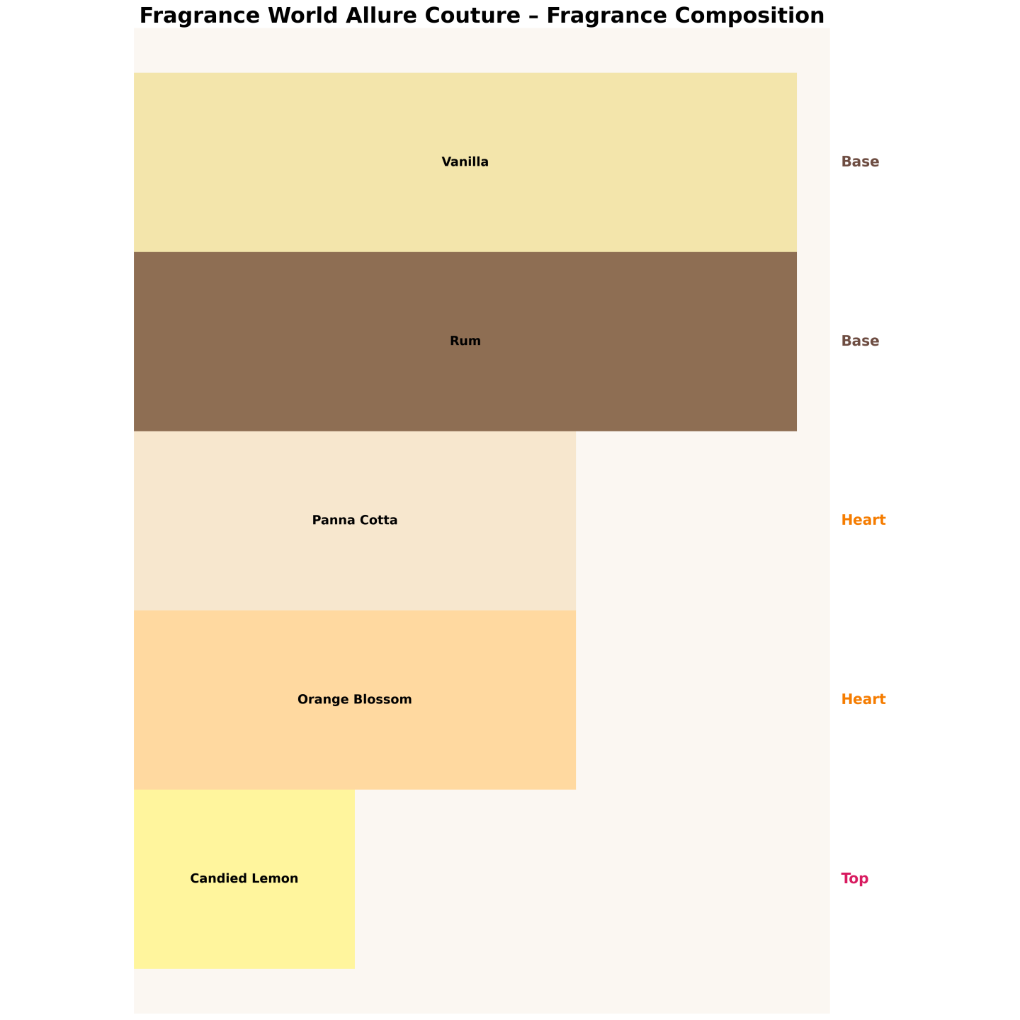 Allure Couture to zapach, który celebruje kobiecą elegancję w najbardziej aksamitnej i wykwintnej formie. To kompozycja dla osób, które kochają perfumy otulające, kremowe i jednocześnie świetliste. Zapach ten buduje wokół noszącej aurę subtelnego luksusu – wyrafinowanego, gourmandowego i wyjątkowo zmysłowego. Otwarcie zachwyca musującą kandyzowaną cytryną, która przenika kompozycję soczystą świeżością i delikatną słodyczą, tworząc energetyczny, zachęcający początek. W sercu zapachu rozwija się eleganckie połączenie kwiatu pomarańczy oraz kremowej panna cotty – to duet, który wnosi do kompozycji kwiatową świetlistość i gourmandową aksamitność. Baza opiera się na ciepłej wanilii oraz wytrawnym akordzie rumu, zapewniając perfumom głębię, zmysłowość i piękne, długotrwałe wykończenie. Zapach idealny zarówno na dzień, jak i wieczór — elegancki, wyrafinowany, ale bez przesady. Unisexowy charakter pozwala nosić go każdemu, kto kocha słodkie, kremowe, luksusowe kompozycje.